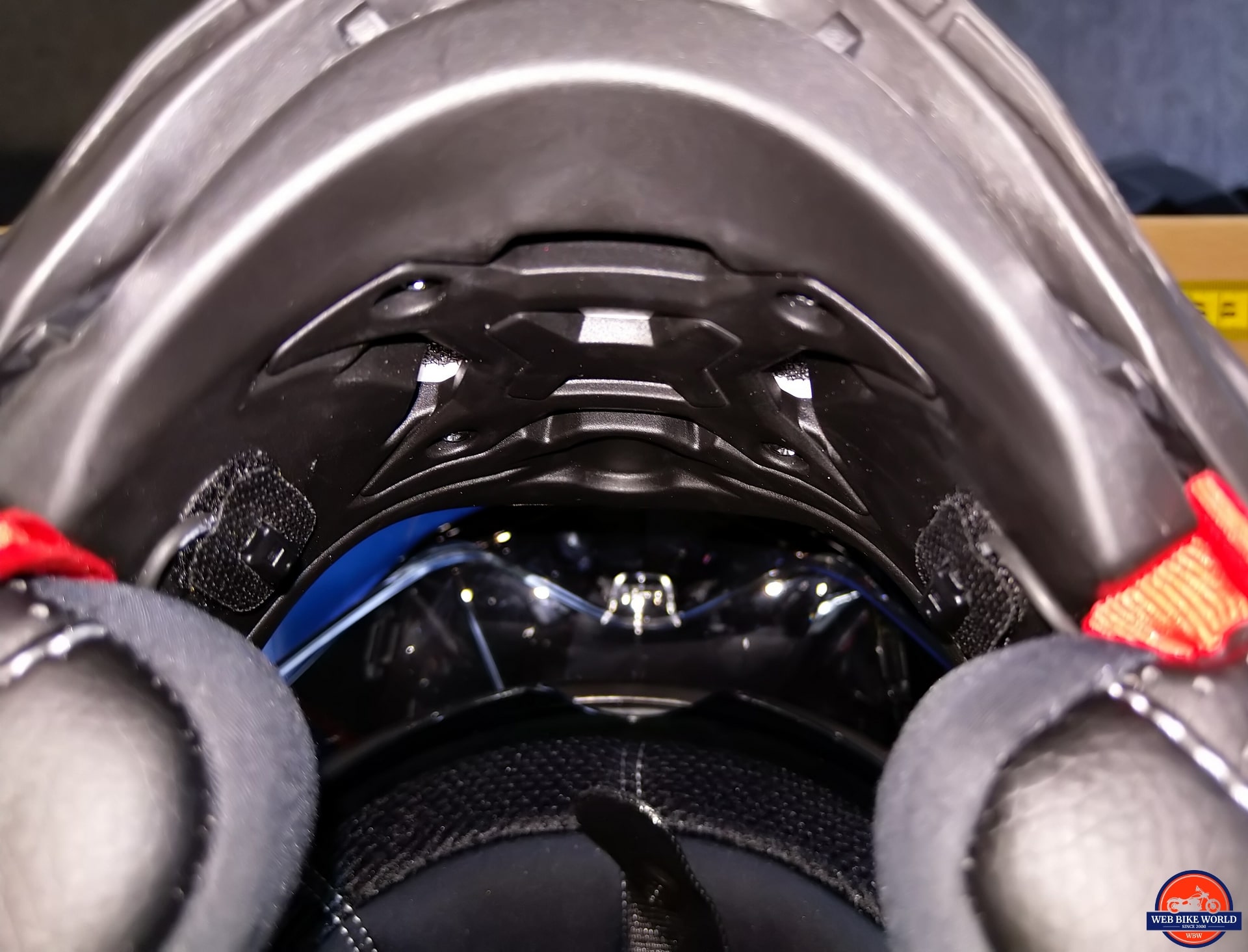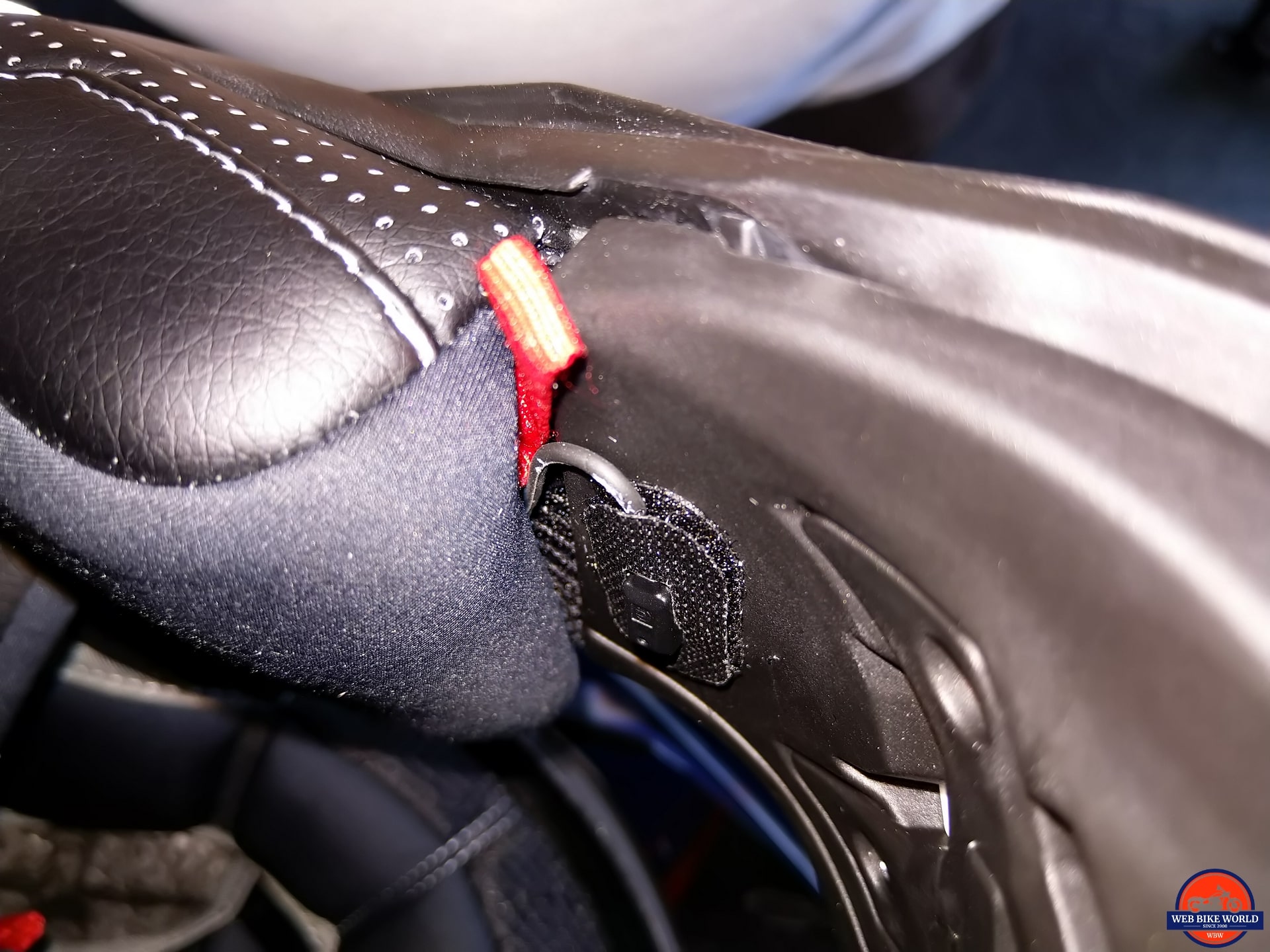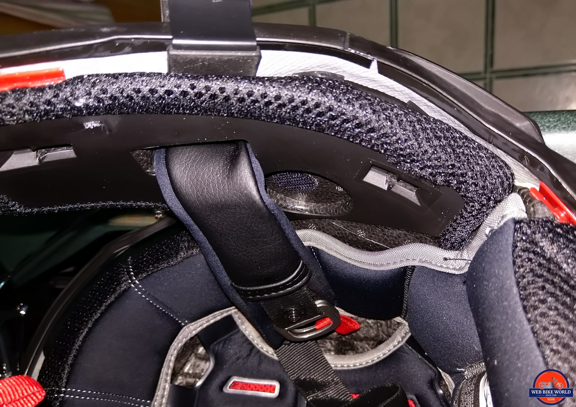 With speakers in the desired position and the microphones placed likewise, the helmet is reassembled and checked for fitment and clearances. There are about three inches of headset lead exiting the left side of the helmet – perfect.