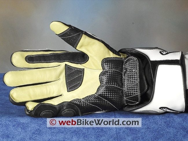 The Veloce Primus gloves have a few added attractions when compared to the less expensive Legionnaire gloves, including the kangaroo leather palms, vented fingers and attached 3rd and 4th fingers for racing.