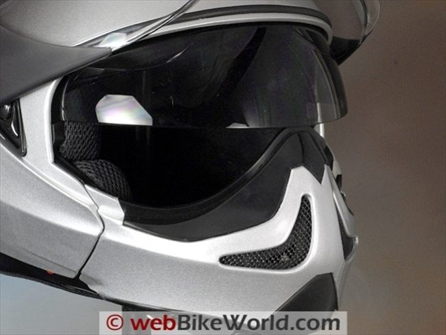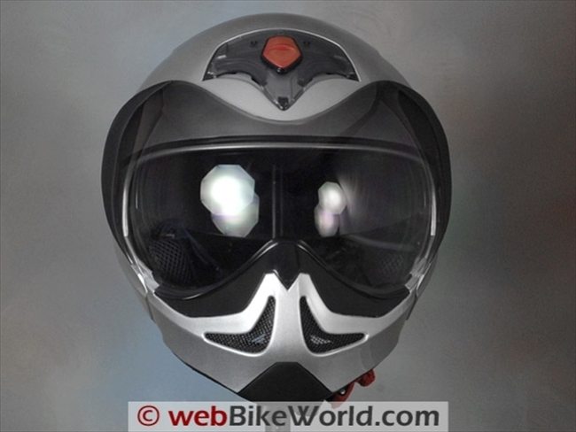 The face shield is shaped so that the nose cut-out is actually necessary, because if the helmet is worn correctly (i.e., pulled down towards the front, over the rider’s head and brow), the face shield provides excellent coverage.