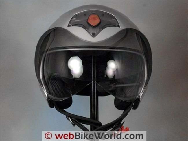The helmet feels unperturbed when riding, and the large face shield does a good job (for an open-face helmet) of protecting the rider’s face from the wind blast.