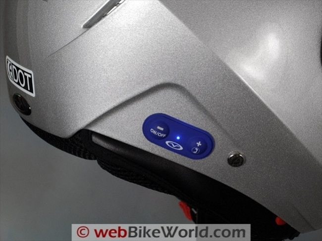 The buttons on the helmet that control the Bluetooth system have a solid feel and they turn the unit on; place it into pairing mode; change the volume (using both) or answer a cell phone (front).