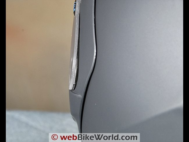 The clear visor has an interesting top-to-bottom profile, and it also has a special lip molded into the top, apparently designed to prevent air and maybe rain from leaking in at the top of the visor.