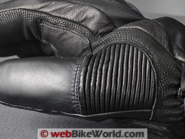 This includes the flattened accordion pleats on the first three fingers, between the main and middle knuckles. These are very nicely constructed with perfect rows of stitching.