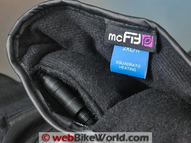 A small lithium-ion battery fits into a pocket in the gauntlet of the Squadra gloves (photo below). The battery measures 53 mm by 35 mm wide and it’s only 10 mm thick. It weighs 49 grams and has an attached connector.
