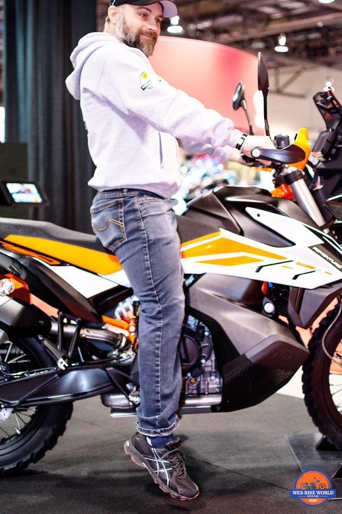 I could opt for the non-R model 790 Adventure (photo below) which has a lower seat height of 32.4 inches instead, but it “only” has 7.5 inches of travel on the suspension and the rear monoshock isn’t equipped with WP’s Progressive Dampening System.