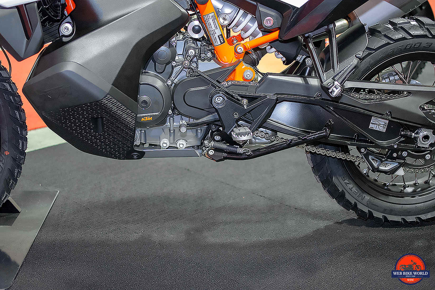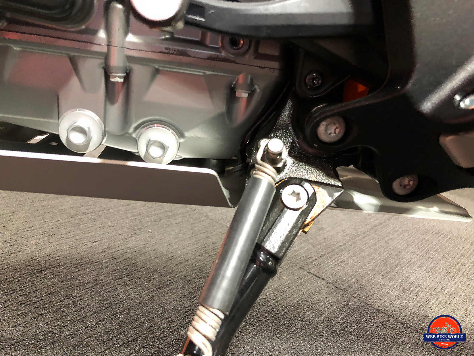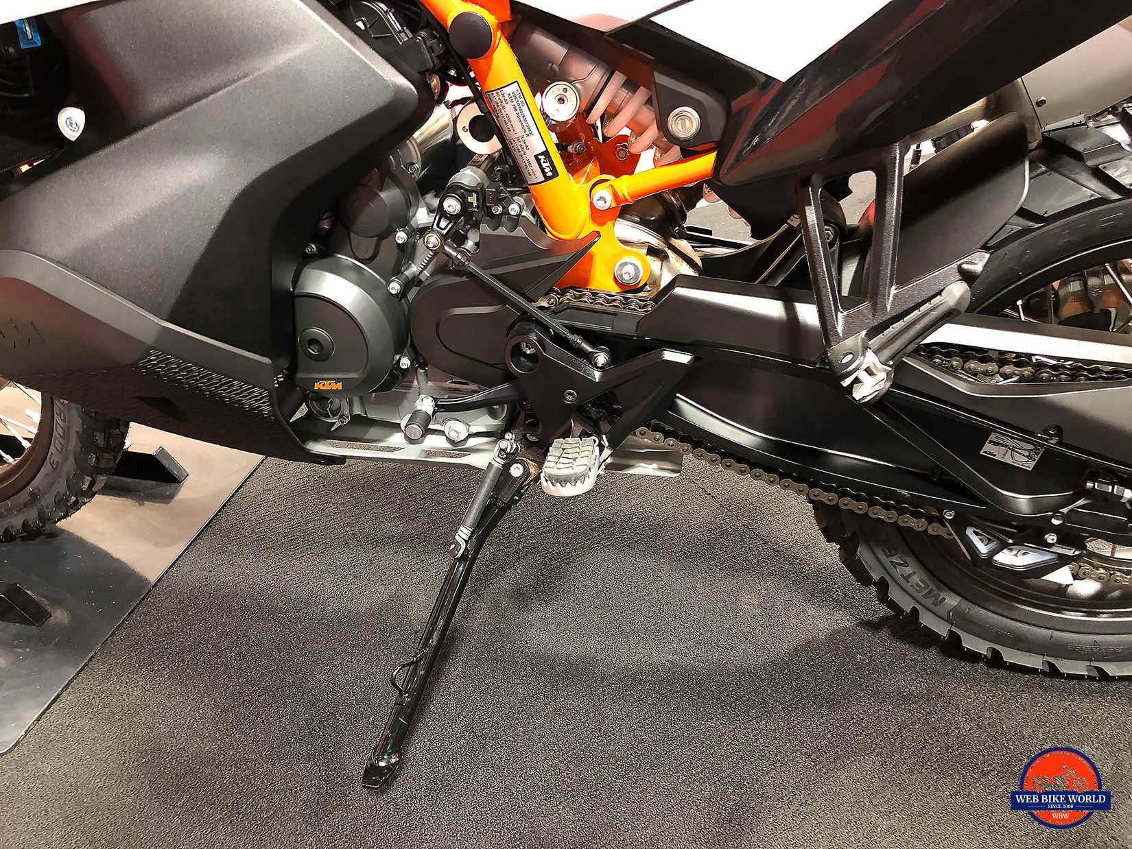 KTM has mounted the side stand on every previous ADV bike to the side of the engine block. This has at times resulted in expensive incidents where the mounting bolts get pulled out and in some cases heavily damaging the engine block when bikes fell over and the end of the kickstand impacted on a rock or something else hard.