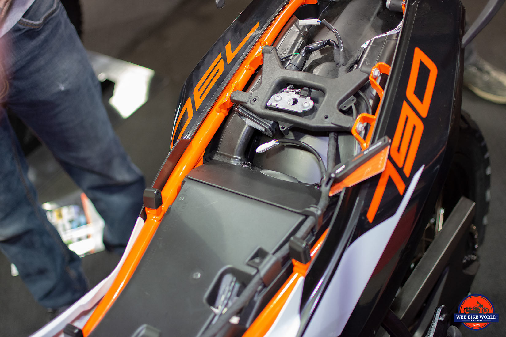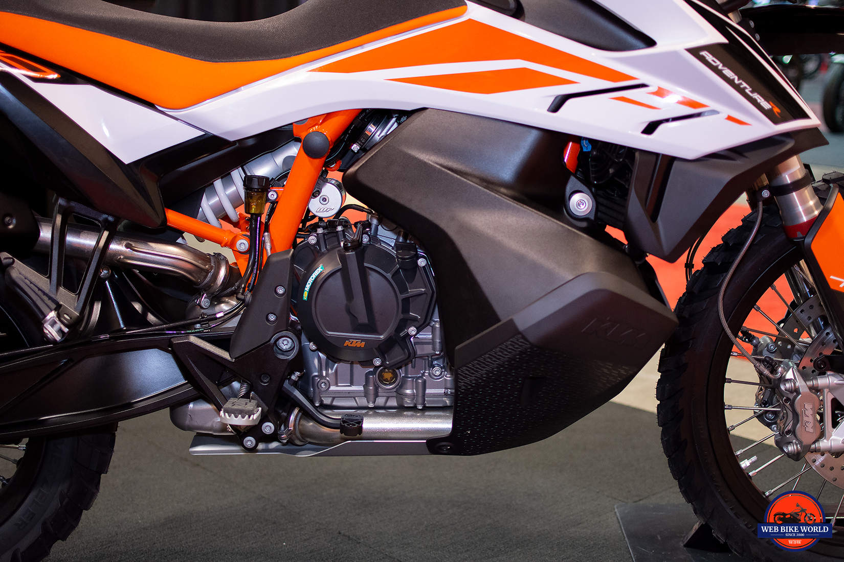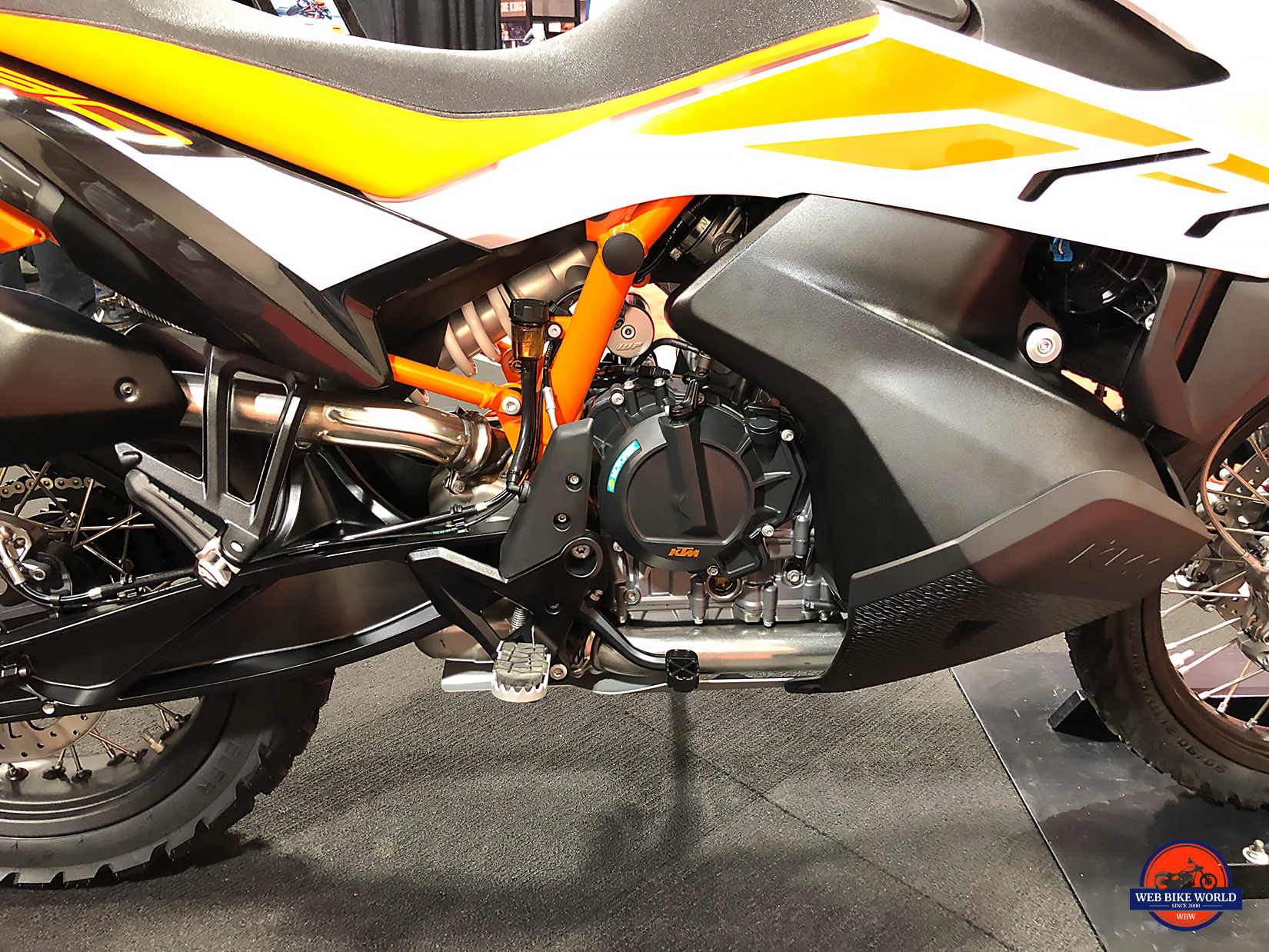 KTM has mounted the side stand on every previous ADV bike to the side of the engine block. This has at times resulted in expensive incidents where the mounting bolts get pulled out and in some cases heavily damaging the engine block when bikes fell over and the end of the kickstand impacted on a rock or something else hard.