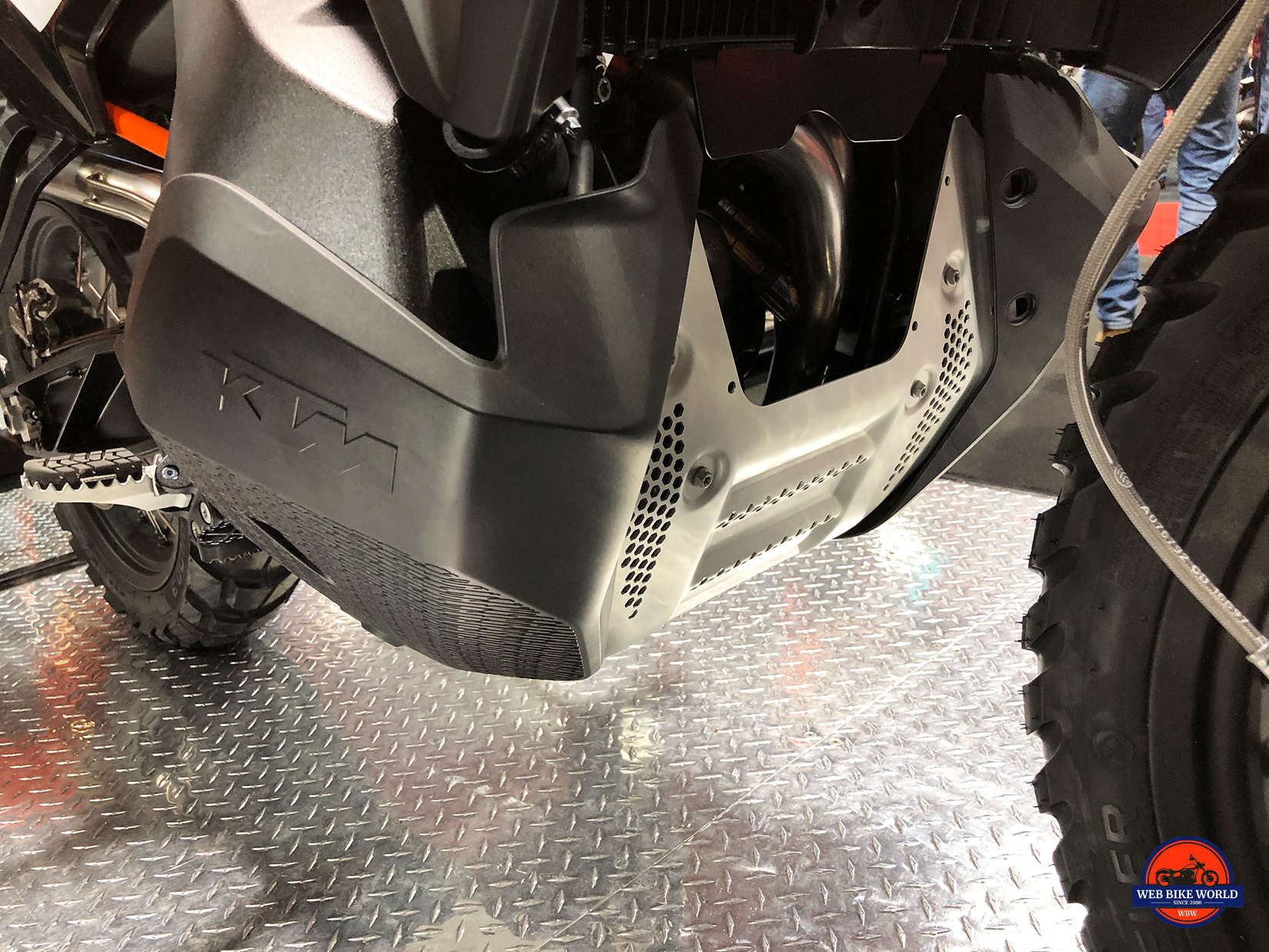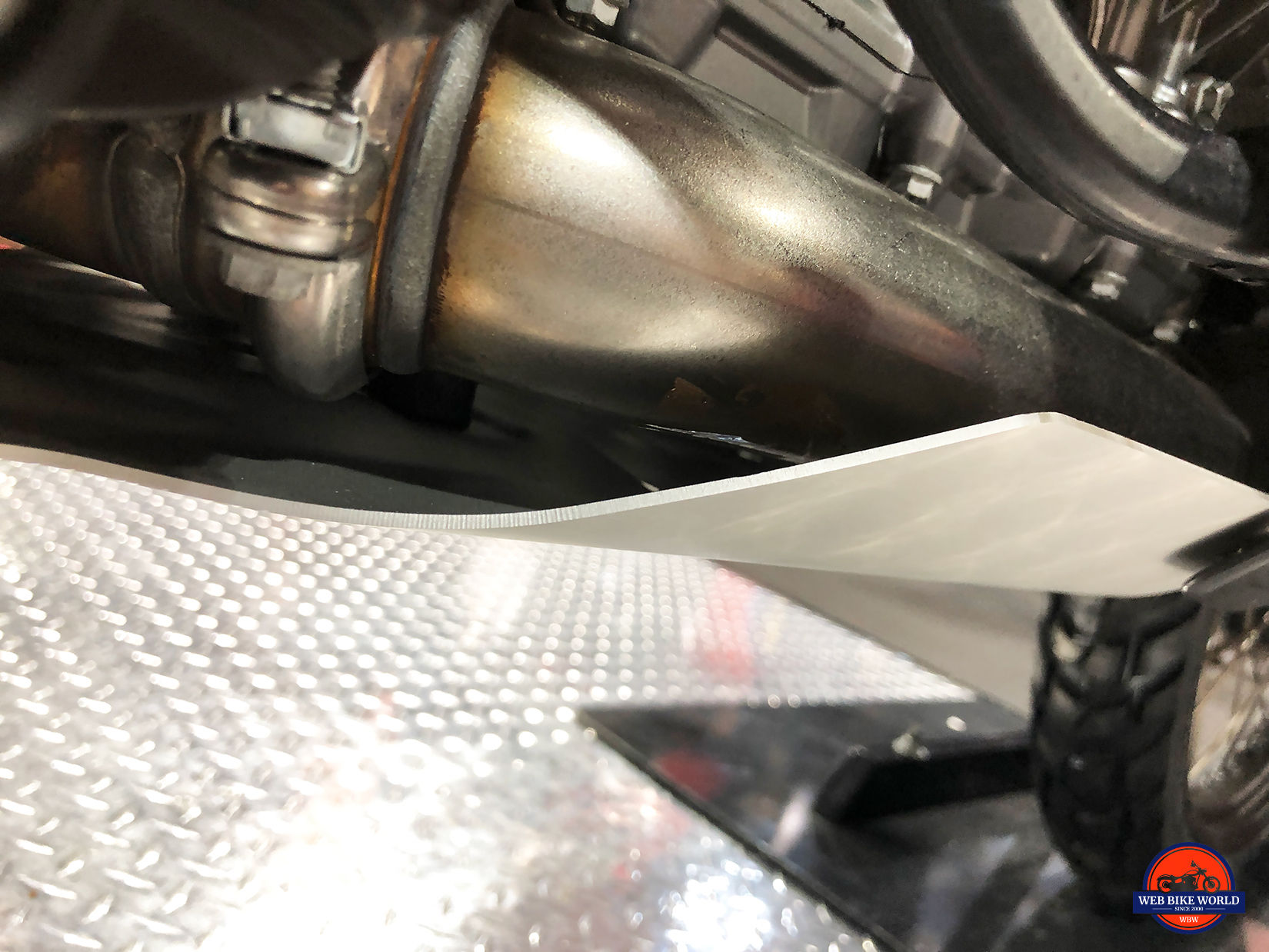 The bash plate on it from the factory is only about ⅛” thick aluminum as you can see in the photos and the exhaust is directly behind it with no frame tube in between to absorb a nasty hit.